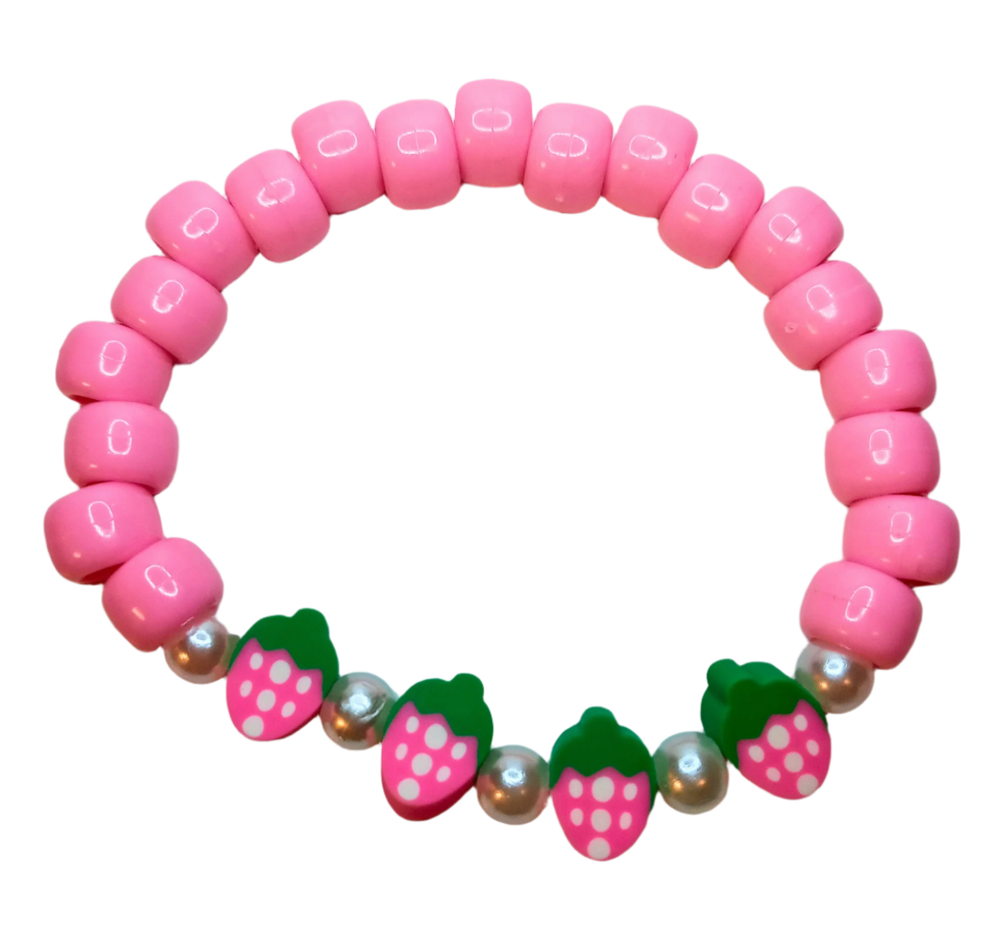 Add a sweet touch to your look with this playful pink beaded bracelet, featuring charming strawberry accents and delicate pearls. Its stretchy design ensures a comfy fit, making it perfect for everyday fun and a pop of fruity flair. | MadebyHuff