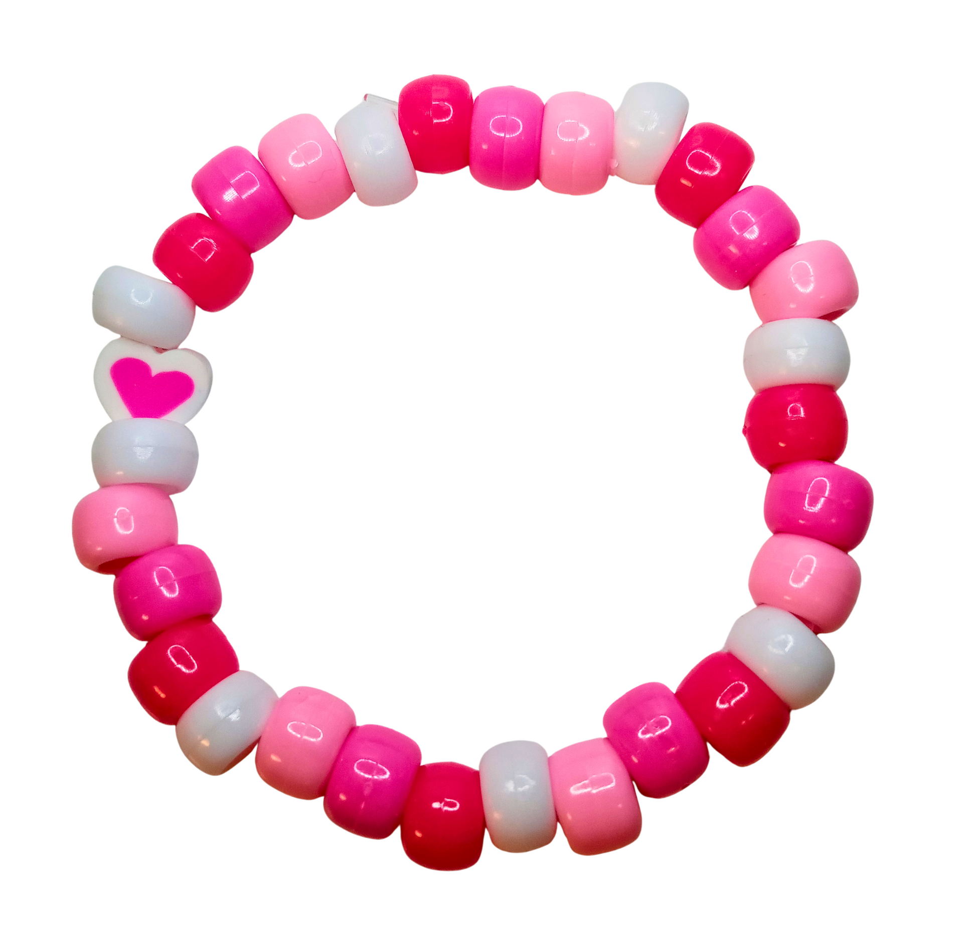 Add a pop of fun with this handmade pink and white beaded bracelet! Stretchy and comfy, it’s perfect for stacking or wearing solo. The sweet heart charm brings a little extra love to your wrist—wear it and spread the good vibes! | MadeByHuff